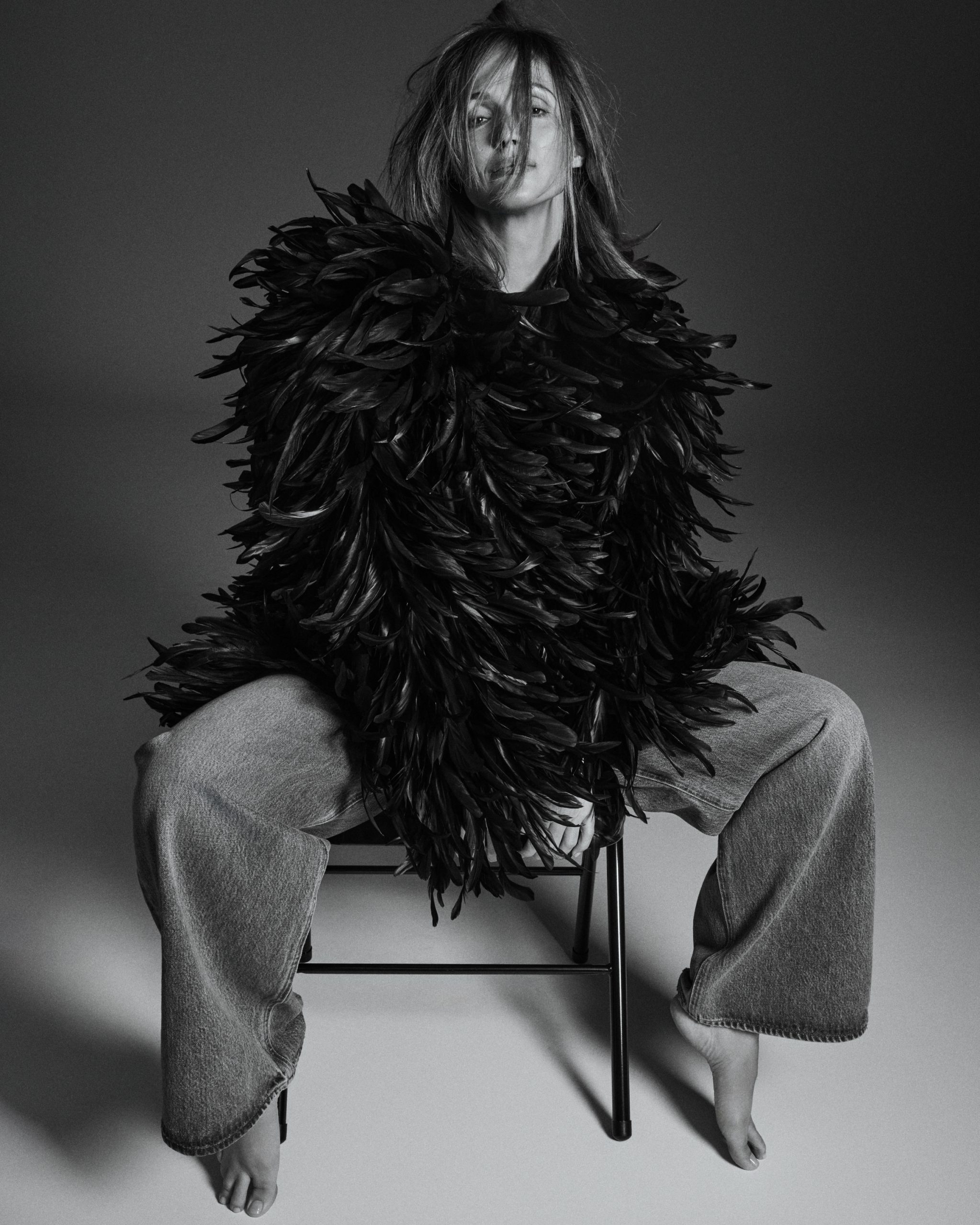 Mantil sa perjem, Gucci. Farmerke, Agolde.