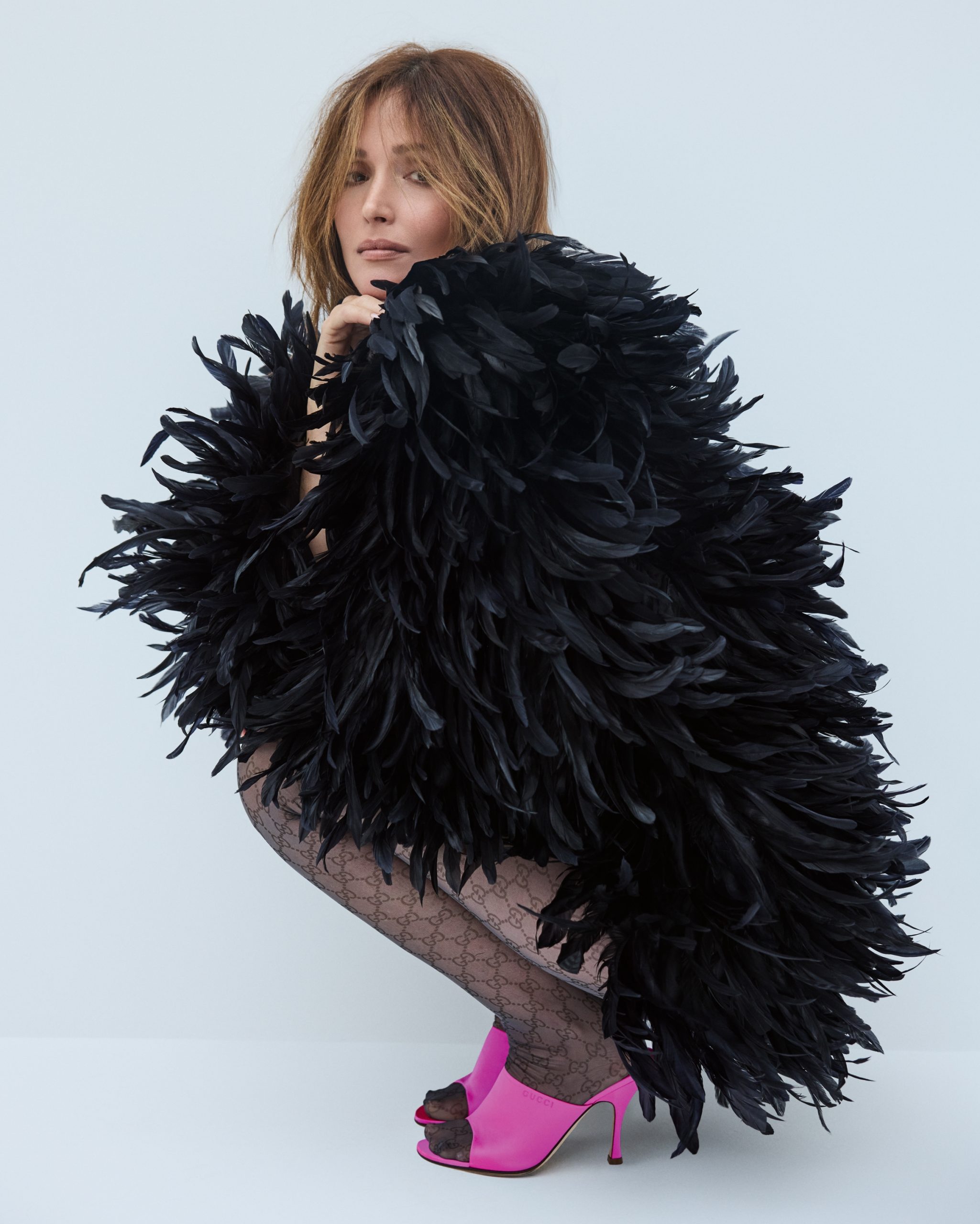 Mantil sa perjem, hulahopke, papuče na štiklu, sve Gucci.