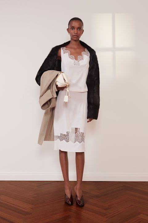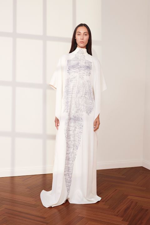 Krokodilska koža pojavljuje se u kaftanu pastelnih nijansi, dok svilene haljine od crepe de chine materijala u nude tonovima sa čipkastim detaljima podsećaju na veš iz dvadesetih, ali u savremenoj, oštroj interpretaciji.