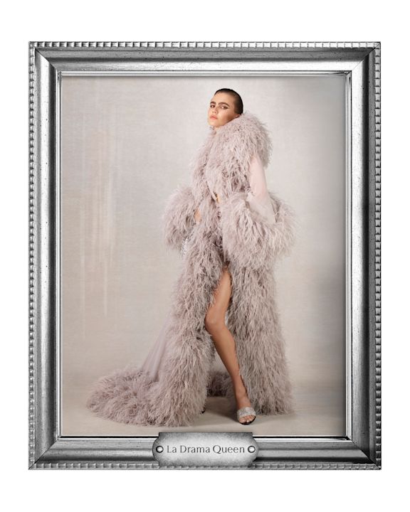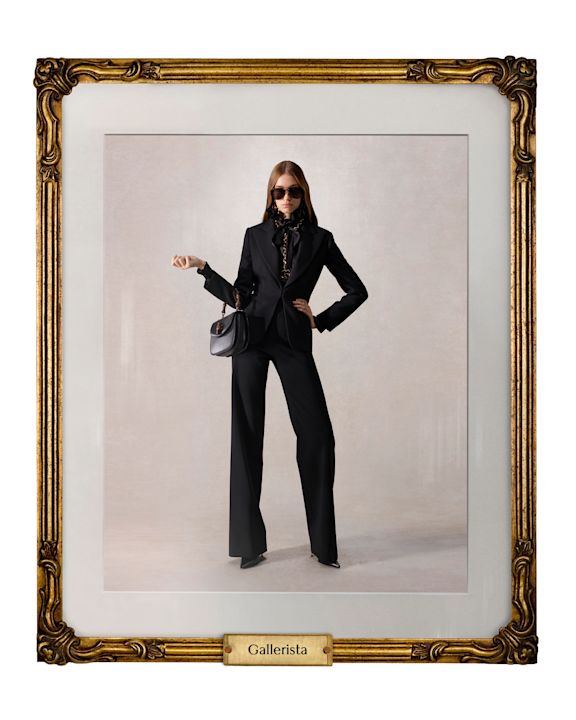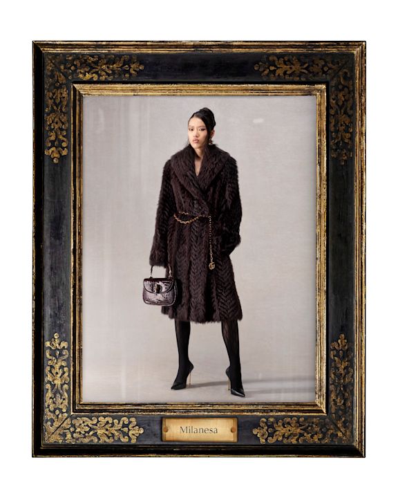 Lookbook dalje kombinuje istorijske kodove brenda sa savremenim likovima: L’Influencer u oversized bomber jakni od braon kože sa gušter teksturom, Nerd sa referencom na Alessandro Michele, kao i večite ikone poput La Mecenate u metalik haljini i La Contessa u Flora printu.