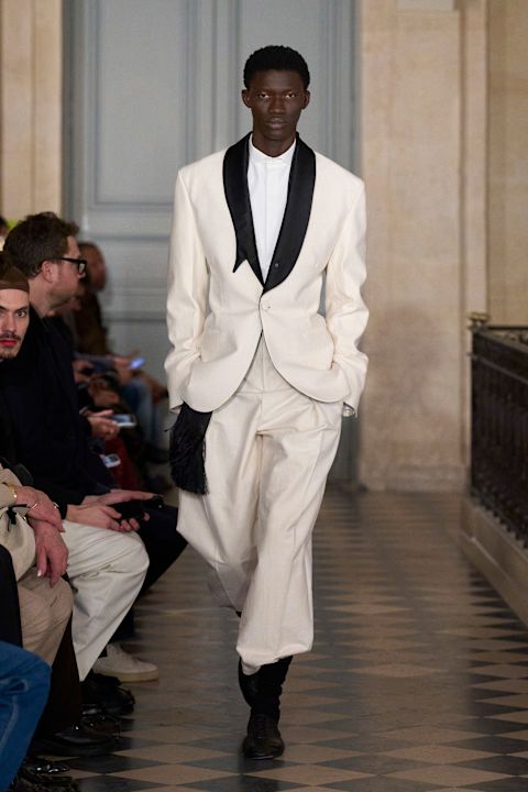 Muška kolekcija donosi više igre, ali bez gubitka fokusa. Smoking jakne uz bokser-šorts i bluze sa tačkama i perjem deluju kao svesna doza ekscentričnosti, dok bela smoking jakna s asimetričnim crnim reverima jasno cilja crveni tepih i nagradne ceremonije. To je Jacquemus koji razmišlja globalno i strateški.