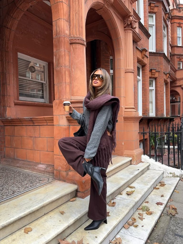 Ako želite da osvežite klasičan izgled, kombinujte braon farmerke uz jarke boje. Ružičasti kašmirski šal, tanke hulahopke ili pistać zeleni detalj takođe će stvoriti balans između topline i svežine.