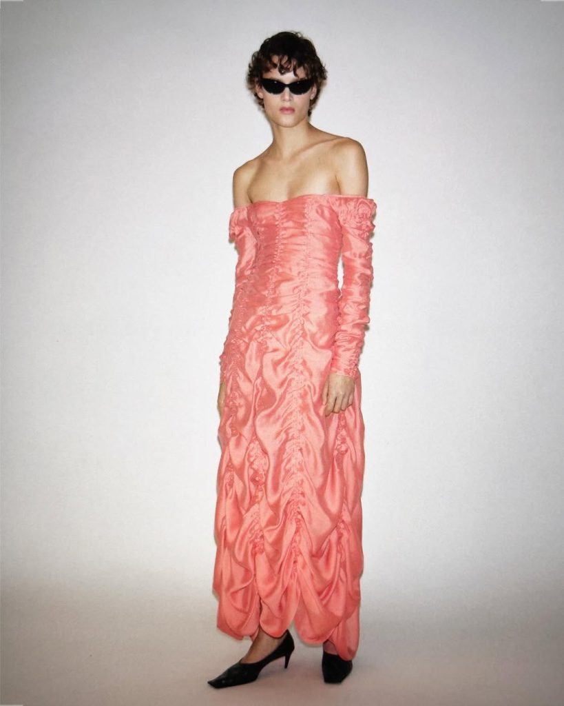 Poseban deo kolekcije čine nabrane haljine u ružičastim tonovima. Ovi modeli prizivaju Courtney Love iz ’90-ih, kroz spoj ranjivosti, senzualnosti i suptilnog bunta. Holstein veruje da današnja Khaite žena reaguje upravo na komade koji nose emociju i zato se Pre Fall 2026 ne boji da bude drska, razigrana i pomalo „čudna“.