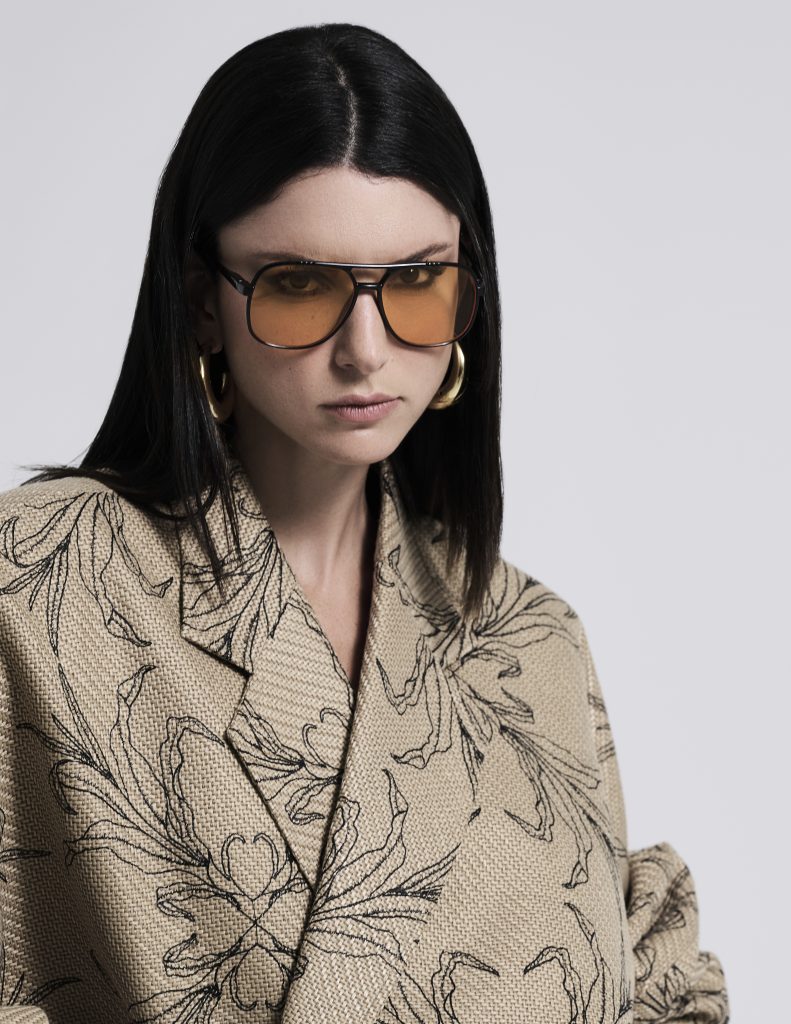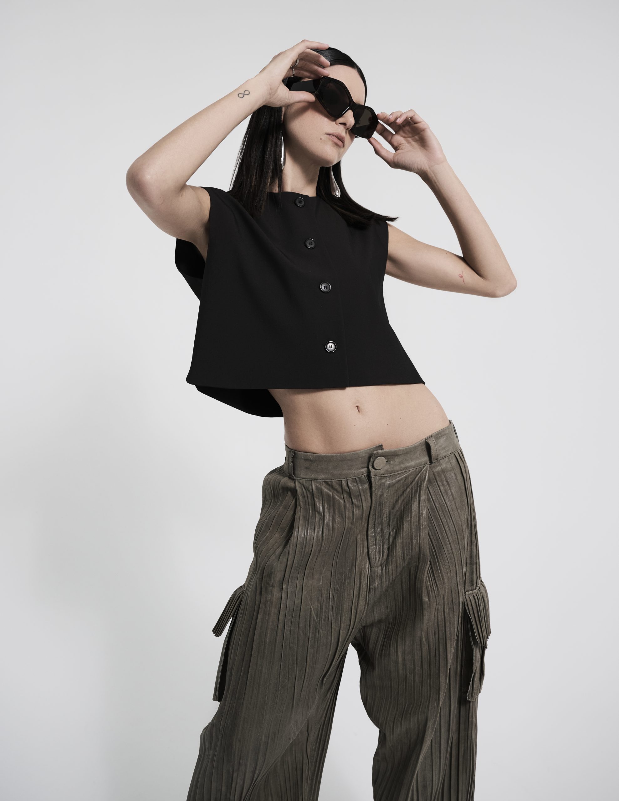 Top by Faride. Pants by Andrea Landa. Sunglasses by Balenciaga.