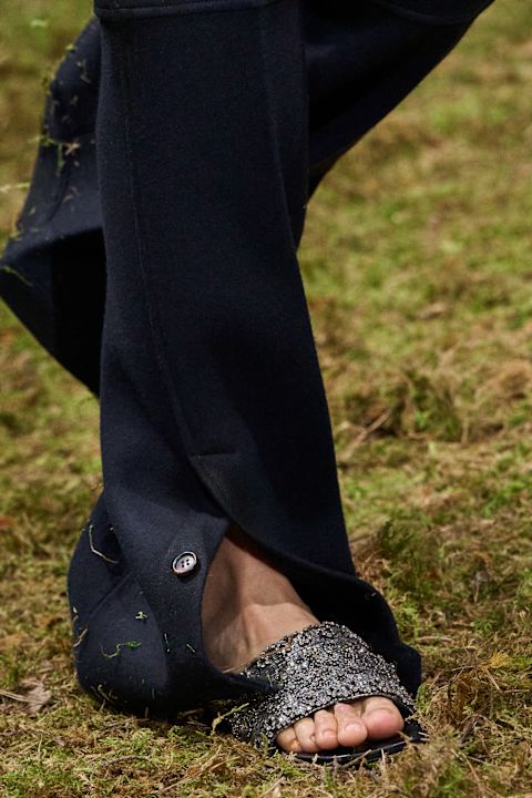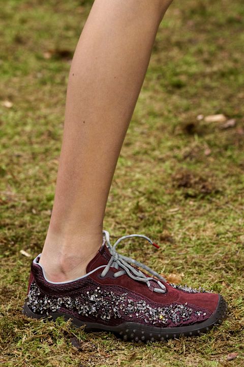 Revija na Nedelji mode u Parizu donela je i niz glamuroznih modela: cipele sa blok potpeticom prekrivene kristalima, bogato ukrašene sandale i dekorativne klompe koje su dodatno naglasile razigrani karakter kolekcije za jesen/zimu 2026.