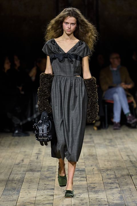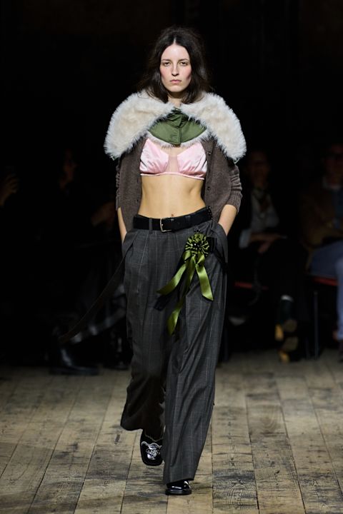 Rozete, inspirisane konjičkim takmičenjima, provlačile su se kroz celu priču. Jedna haljina izgledala je kao da je sačinjena samo od dugih trakastih rozeta, dok su maslinaste taft kreacije nosile gotovo dečju, razigranu energiju. Džepovi u formi čvorova od traka, metalni detalji nalik konjskoj opremi i naglašeni grometi unosili su dozu grubosti.