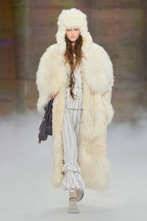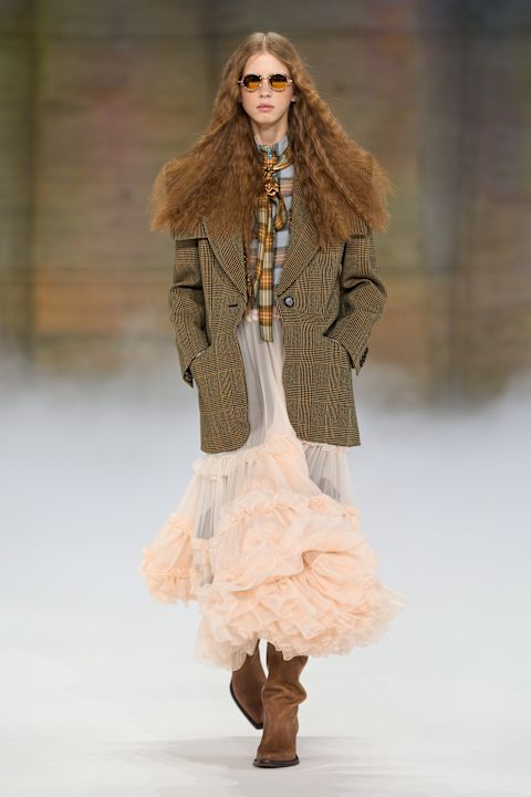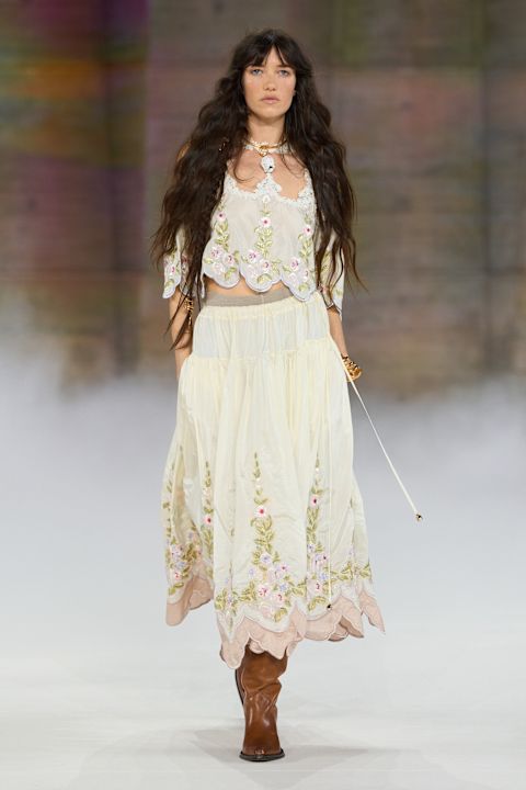 Atmosfera na pisti prizivala je gotovo filmsku sliku: Chloé devojke kao da izlaze iz lagane magle, sa kosom koju nosi vetar dok se karirane suknje šire u pokretu. Estetika kolekcije oslanja se na više kulturnih referenci – pomalo Joni Mitchell iz perioda Ladies of the Canyon, zatim Kate Bush, ali i nasleđe Karla Lagerfelda. U pojedinim siluetama mogao se prepoznati i duh Ralph Laurena iz kasnih sedamdesetih godina.