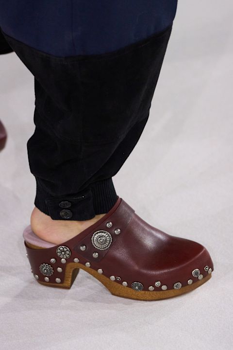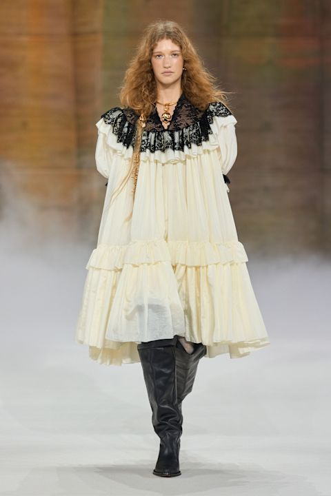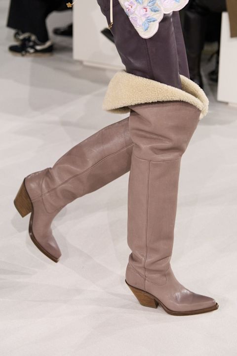 Kada je u pitanju obuća, kolekcija Chloé jesen/zima 2026. vratila je nekoliko upečatljivih modela. Na pisti su se pojavile klompe, zatim kaubojske čizme, ali i visoke čizme do butina u stilu musketeera – kombinacija koja priziva i Karl Lagerfeld eru u kući Chloé i scensku estetiku Kate Bush.