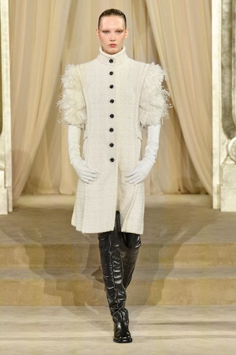 Bez ključne kreativne vizije (Matthieu Blazy debi se očekuje na jesen), kolekciju potpisuje tim. Inspiracija? Zimska škotska visoravan koje je Coco Chanel obožavala. Paleta je bila monohromatska: zimsko-bela, bež i crna. Siluete tople ali eterične. Tvid kao stvoren za slojevite jakne koje podsećaju na lovačke, a čizme su pružile prizemljenost za inače romantičan Chanel univerzum.