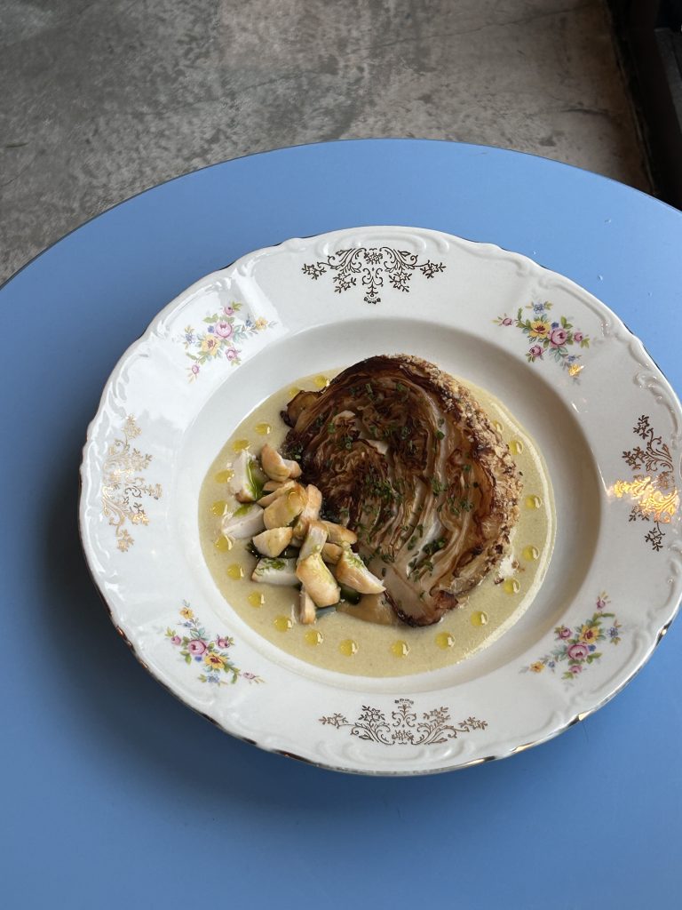 Pečeni kupus, sos au bleu od plavog sira, jakobove kapice, tartufovo ulje